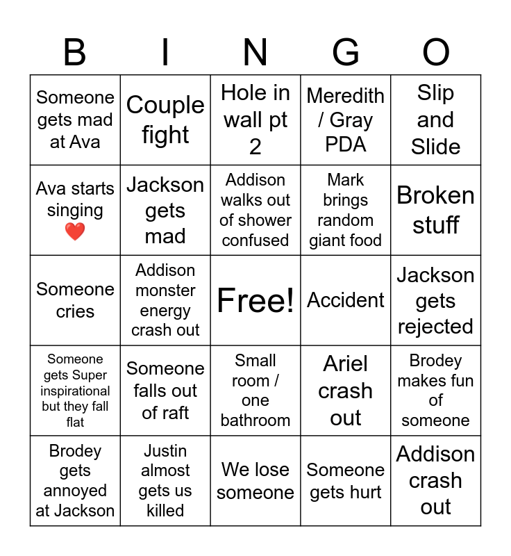 This bingo card has a free space and 24 words: Someone falls out of raft, Justin almost gets us killed, Addison walks out of shower confused, Brodey gets annoyed at Jackson, Slip and Slide, Someone gets mad at Ava, Ava starts singing ❤️, Couple fight, Accident, Small room / one bathroom, Mark brings random giant food, Someone cries, Ariel crash out, Brodey makes fun of someone, Jackson gets mad, Someone gets hurt, Jackson gets rejected, Hole in wall pt 2, Broken stuff, Addison monster energy crash out, Addison crash out, Someone gets Super inspirational but they fall flat, Meredith / Gray PDA and We lose someone.