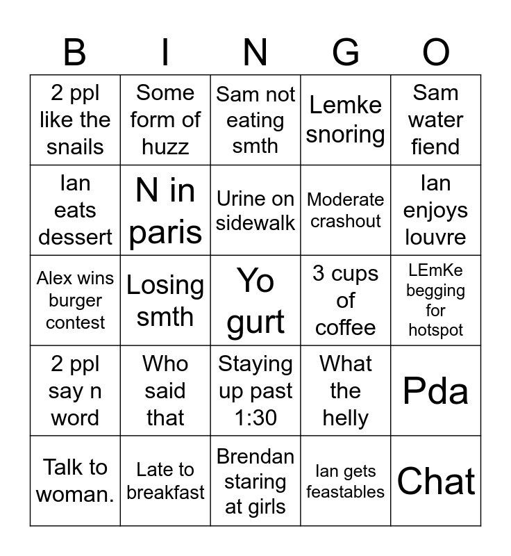 This bingo card has a free space and 24 words: Who said that, Late to breakfast, Urine on sidewalk, Talk to woman., Sam water fiend, 2 ppl like the snails, Ian eats dessert, Some form of huzz, 3 cups of coffee, Staying up past 1:30, Moderate crashout, Alex wins burger contest, What the helly, Pda, N in paris, Ian gets feastables, LEmKe begging for hotspot, Sam not eating smth, Ian enjoys louvre, Losing smth, Chat, 2 ppl say n word, Lemke snoring and Brendan staring at girls.