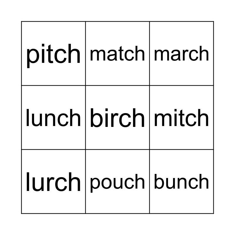 This bingo card has 12 words: bench, bunch, birch, mitch, match, march, pouch, patch, pitch, lunch, lurch and latch.