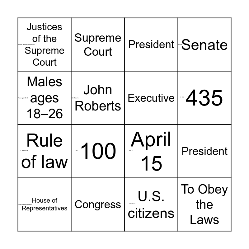 This bingo card has 11 images and 16 words: Congress, President, President, Justices of the Supreme Court, Rule of law, Supreme Court, April 15, U.S. citizens, Males ages 18–26, John Roberts, House of Representatives, Senate, 100, 435, Executive and To Obey the Laws.