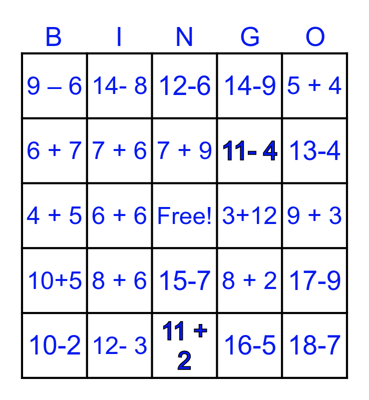 This bingo card has a free space and 24 words: 8 + 6, 12- 3, 7 + 9, 10-2, 5 + 4, 9 – 6, 6 + 7, 14- 8, 3+12, 15-7, 11- 4, 4 + 5, 8 + 2, 17-9, 7 + 6, 16-5, 9 + 3, 12-6, 13-4, 6 + 6, 18-7, 10+5, 14-9 and 11 + 2.