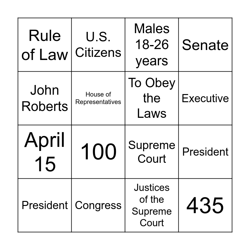 This bingo card has 16 words: Congress, President, Males 18-26 years, Rule of Law, April 15, U.S. Citizens, Supreme Court, Justices of the Supreme Court, John Roberts, House of Representatives, President, Senate, 100, Executive, To Obey the Laws and 435.