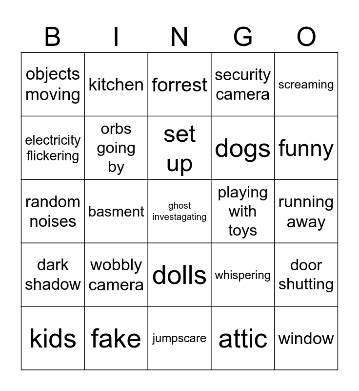 This bingo card has a free space and 24 words: wobbly camera, fake, set up, kids, screaming, objects moving, electricity flickering, kitchen, playing with toys, dolls, dogs, random noises, whispering, door shutting, orbs going by, attic, running away, forrest, funny, basment, window, dark shadow, security camera and jumpscare.