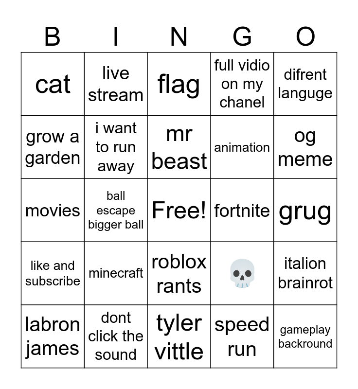 This bingo card has a free space and 24 words: minecraft, dont click the sound, mr beast, labron james, difrent languge, cat, grow a garden, live stream, fortnite, roblox rants, animation, movies, 💀, italion brainrot, i want to run away, speed run, grug, flag, og meme, ball escape bigger ball, gameplay backround, like and subscribe, full vidio on my chanel and tyler vittle.