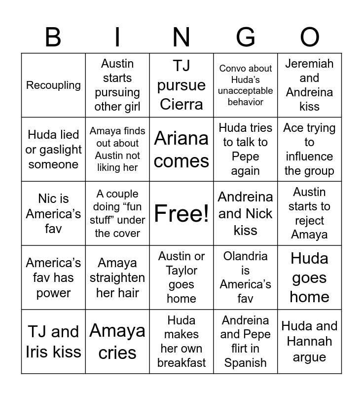 This bingo card has a free space and 24 words: Amaya straighten her hair, Amaya cries, Ariana comes, TJ and Iris kiss, Jeremiah and Andreina kiss, Recoupling, Huda lied or gaslight someone, Austin starts pursuing other girl, Andreina and Nick kiss, Austin or Taylor goes home, Huda tries to talk to Pepe again, Nic is America’s fav, Olandria is America’s fav, Huda goes home, Amaya finds out about Austin not liking her, Andreina and Pepe flirt in Spanish, Austin starts to reject Amaya, TJ pursue Cierra, Ace trying to influence the group, A couple doing “fun stuff” under the cover, Huda and Hannah argue, America’s fav has power, Convo about Huda’s unacceptable behavior and Huda makes her own breakfast.