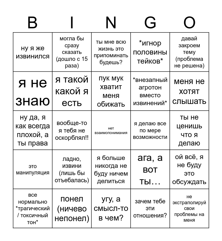 This bingo card has a free space and 24 words: ладно, извини (лишь бы отъебалась), понел (ничево непонел), пук мук хватит меня обижать, все нормально *трагический / токсичный тон*, давай закроем тему (проблема не решена), ну я же извинился, я не знаю, могла бы сразу сказать (дошло с 15 раза), я делаю все по мере возможности, я больше никогда не буду ничем делиться, *внезапный агротон вместо извинений*, ну да, я как всегда плохой, а ты права, ага, а вот ты…, ой всё, я не буду это обсуждать, я такой какой я есть, зачем тебе эти отношения?, ты не ценишь что я делаю, ты мне всю жизнь это припоминать будешь?, меня не хотят слышать, вообще-то я тебя не оскорблял!!, не экстраполируй свои проблемы на меня, это манипуляция, *игнор половины тейков* and угу, а смысл-то в чем?.