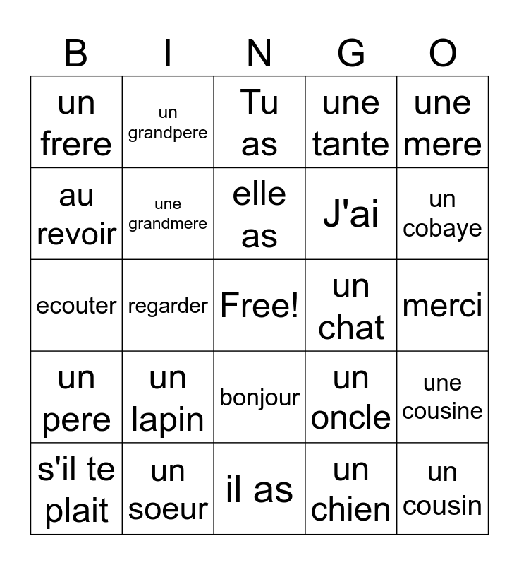 This bingo card has a free space and 24 words: un lapin, un soeur, elle as, s'il te plait, une mere, un frere, au revoir, un grandpere, un chat, bonjour, J'ai, ecouter, un oncle, une cousine, une grandmere, un chien, merci, Tu as, un cobaye, regarder, un cousin, un pere, une tante and il as.