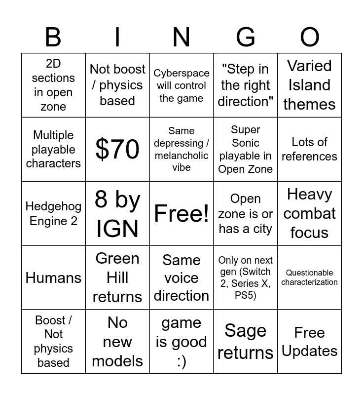 This bingo card has a free space and 24 words: Green Hill returns, No new models, Same depressing / melancholic vibe, Boost / Not physics based, Varied Island themes, 2D sections in open zone, Multiple playable characters, Not boost / physics based, Open zone is or has a city, Same voice direction, Super Sonic playable in Open Zone, Hedgehog Engine 2, Only on next gen (Switch 2, Series X, PS5), Questionable characterization, $70, Sage returns, Heavy combat focus, Cyberspace will control the game, Lots of references, 8 by IGN, Free Updates, Humans, "Step in the right direction" and game is good :).