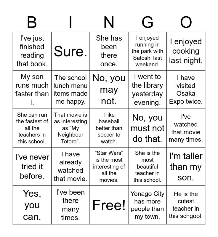 This bingo card has 30 words: Free!, I have to cook dinner tonight., The school lunch menu items made me happy., I must take my son to the dentist this weekend., I enjoyed running in the park with Satoshi last weekend., I enjoyed cooking last night., I've just finished reading that book., I have already watched that movie., I like baseball better than soccer to watch., Yonago City has more people than my town., I'm taller than my son., My son runs much faster than I., She can speak it better than me., I like swimming more than running., She is the most beautiful teacher in this school., He is the cutest teacher in this schgool., She can run the fastest of all the teachers in this school., That movie is as interesting as "My Neighbour Totoro"., "Star Wars" is the most interesting of all the movies., I went to the library yesterday evening., I've watched that movie many times., Yes, you can., Sure., No, you may not., No, you must not do that., I have visited Osaka Expo twice., I've never tried it before., I've been there many times., She has been there once. and She has already punched me many times today..