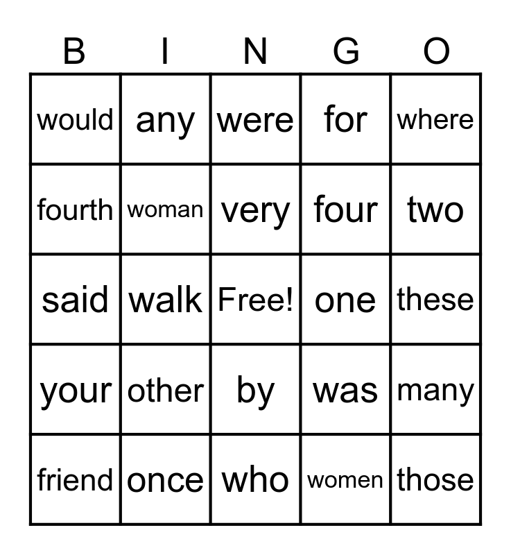 This bingo card has a free space and 29 words: friend, there, walk, because, would, were, woman, other, one, once, these, those, who, women, two, be, by, your, where, said, was, for, four, fourth, for, any, many, very and all.