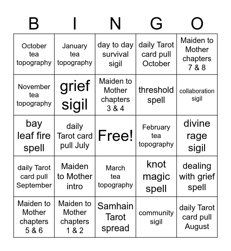 This bingo card has a free space and 24 words: Maiden to Mother intro, Maiden to Mother chapters 1 & 2, Maiden to Mother chapters 3 & 4, Maiden to Mother chapters 5 & 6, Maiden to Mother chapters 7 & 8, October tea topography, November tea topography, January tea topography, February tea topography, March tea topography, threshold spell, bay leaf fire spell, knot magic spell, dealing with grief spell, grief sigil, community sigil, divine rage sigil, day to day survival sigil, collaboration sigil, daily Tarot card pull July, daily Tarot card pull August, daily Tarot card pull September, daily Tarot card pull October and Samhain Tarot spread.
