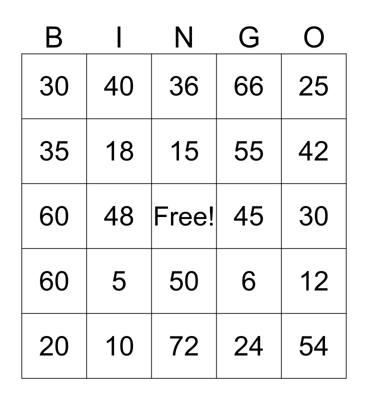 This bingo card has a free space and 24 words: 5, 10, 15, 20, 25, 30, 35, 40, 45, 50, 55, 60, 6, 12, 18, 24, 30, 36, 42, 48, 54, 60, 66 and 72.