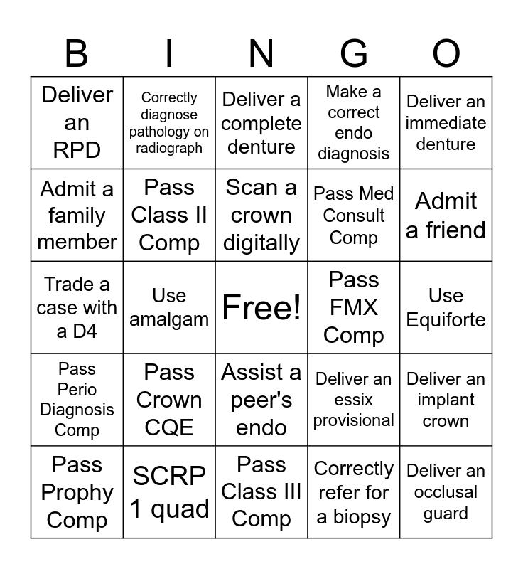 This bingo card has a free space and 24 words: Pass Crown CQE, SCRP 1 quad, Scan a crown digitally, Pass Prophy Comp, Deliver an immediate denture, Deliver an RPD, Admit a family member, Correctly diagnose pathology on radiograph, Pass FMX Comp, Assist a peer's endo, Pass Med Consult Comp, Trade a case with a D4, Deliver an essix provisional, Deliver an implant crown, Pass Class II Comp, Correctly refer for a biopsy, Use Equiforte, Deliver a complete denture, Admit a friend, Use amalgam, Deliver an occlusal guard, Pass Perio Diagnosis Comp, Make a correct endo diagnosis and Pass Class III Comp.