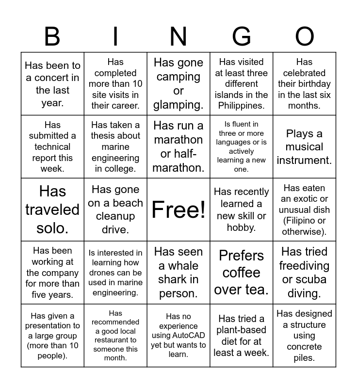 This bingo card has a free space and 50 words: Has ridden a boat as part of a site visit to a port., Has designed a structure using concrete piles., Has done a site inspection in the last three months., Has no experience using AutoCAD yet but wants to learn., Is interested in learning how drones can be used in marine engineering., Has been to a lighthouse., Has completed more than 10 site visits in their career., Can explain the difference between a breakwater and a seawall., Has submitted a technical report this week., Has worked overtime more than 8 hours in a single week., Has taken a thesis about marine engineering in college., Has visited at least three different islands in the Philippines., Has tried freediving or scuba diving., Prefers coffee over tea., Has more than one pet or owns an unusual pet (e.g., reptile, exotic bird)., Has cooked a Filipino dish this week., Has run a marathon or half-marathon., Has recently learned a new skill or hobby., Is the eldest sibling in their family., Has celebrated their birthday in the last six months., Has gone on a beach cleanup drive., Has tried a plant-based diet for at least a week., Has been to a concert in the last year., Is fluent in three or more languages or is actively learning a new one., Has a certification outside of engineering., Has had a relationship change (started or ended) in the last year., Plays a musical instrument., Has never been to Boracay., Has gone camping or glamping., Has seen a whale shark in person., Has helped a colleague with a non-work related issue., Discovered something unexpectedly interesting or fun on a site visit., Has worked on a project involving dredging., Has used geotechnical software recently., Has recommended a good local restaurant to someone this month., Has been to Intramuros in the last year., Has taken public transportation to work today., Can sing a specific genre of karaoke (e.g., OPM, rock, ballad)., Has volunteered for a cause in the last year., Has eaten an exotic or unusual dish (Filipino or otherwise)., Has successfully grown a plant indoors., Has had a momentary internet or microphone mishap during a video call., Has designed something using steel structures., Has done a soil boring investigation., Has given a presentation to a large group (more than 10 people)., Has traveled solo., Has watched a K-drama or anime series in the last month., Has a favorite sport they actively play or watch., Has been working at the company for more than five years. and Is planning a vacation in the next six months..