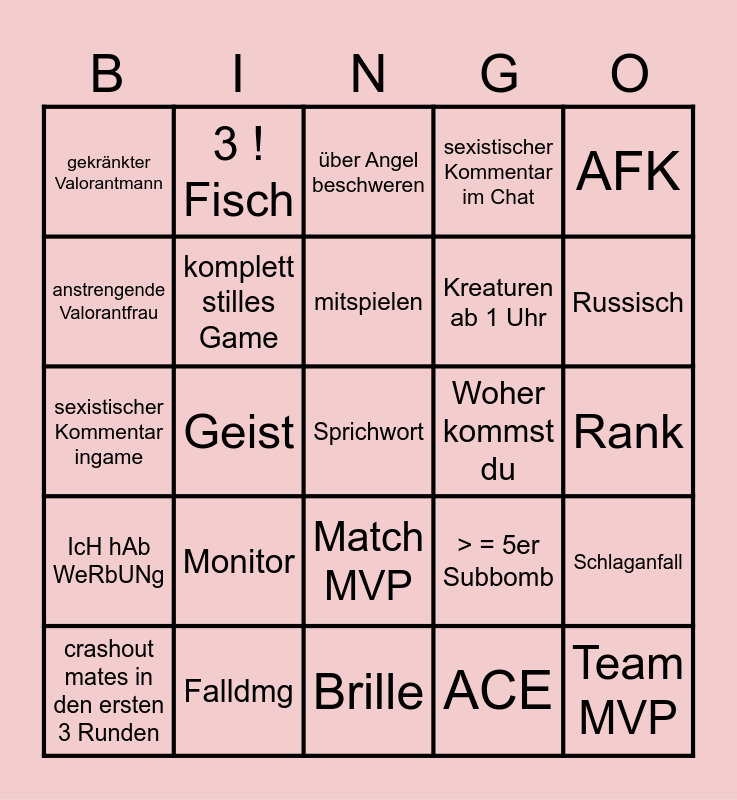 This bingo card has 25 words: Monitor, Brille, mitspielen, crashout mates in den ersten 3 Runden, AFK, gekränkter Valorantmann, anstrengende Valorantfrau, 3 ! Fisch, Woher kommst du, Match MVP, Kreaturen ab 1 Uhr, sexistischer Kommentar ingame, > = 5er Subbomb, Schlaganfall, komplett stilles Game, Team MVP, Rank, über Angel beschweren, Russisch, Geist, Sprichwort, Falldmg, IcH hAb WeRbUNg, sexistischer Kommentar im Chat and ACE.