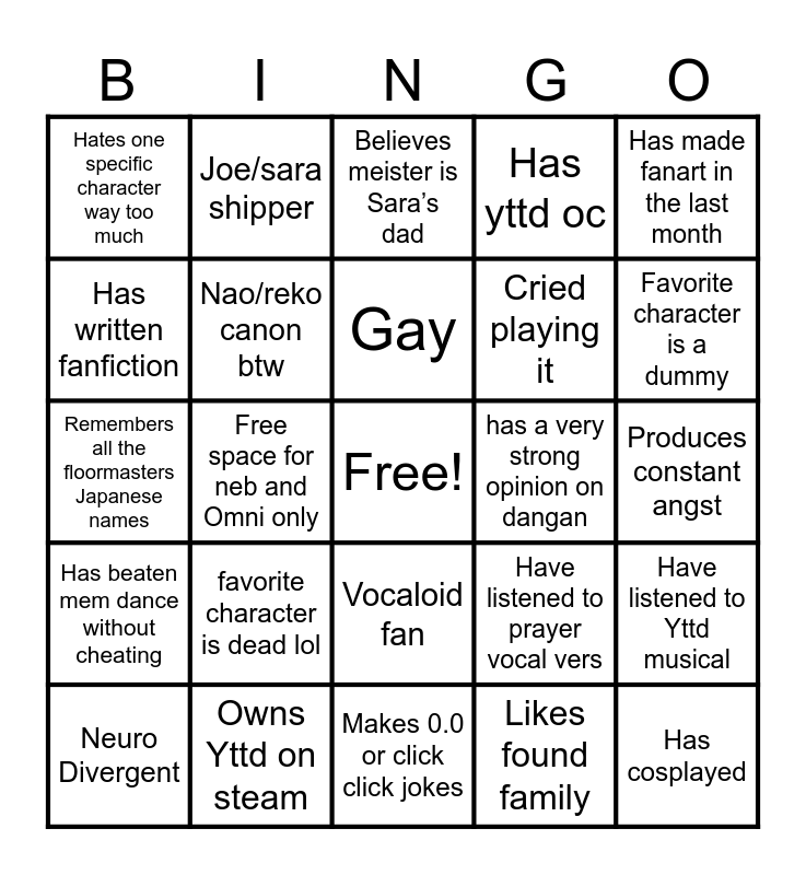 This bingo card has a free space and 24 words: favorite character is dead lol, Owns Yttd on steam, Gay, Neuro Divergent, Has made fanart in the last month, Hates one specific character way too much, Has written fanfiction, Joe/sara shipper, has a very strong opinion on dangan, Vocaloid fan, Cried playing it, Remembers all the floormasters Japanese names, Have listened to prayer vocal vers, Have listened to Yttd musical, Nao/reko canon btw, Likes found family, Produces constant angst, Believes meister is Sara’s dad, Favorite character is a dummy, Free space for neb and Omni only, Has cosplayed, Has beaten mem dance without cheating, Has yttd oc and Makes 0.0 or click click jokes.