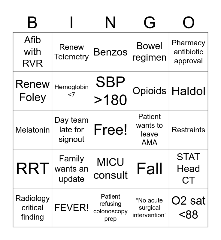 This bingo card has a free space and 24 words: Family wants an update, FEVER!, SBP >180, Radiology critical finding, Pharmacy antibiotic approval, Afib with RVR, Renew Foley, Renew Telemetry, Patient wants to leave AMA, MICU consult, Opioids, Melatonin, Fall, STAT Head CT, Hemoglobin <7, “No acute surgical intervention”, Restraints, Benzos, Haldol, Day team late for signout, O2 sat <88, RRT, Bowel regimen and Patient refusing colonoscopy prep.