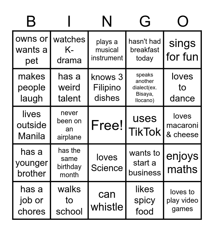 This bingo card has a free space and 24 words: has the same birthday month, walks to school, knows 3 Filipino dishes, has a job or chores, sings for fun, owns or wants a pet, makes people laugh, watches K-drama, uses TikTok, loves Science, speaks another dialect(ex. Bisaya, Ilocano), lives outside Manila, wants to start a business, enjoys maths, has a weird talent, likes spicy food, loves macaroni & cheese, plays a musical instrument, loves to dance, never been on an airplane, loves to play video games, has a younger brother, hasn't had breakfast today and can whistle.