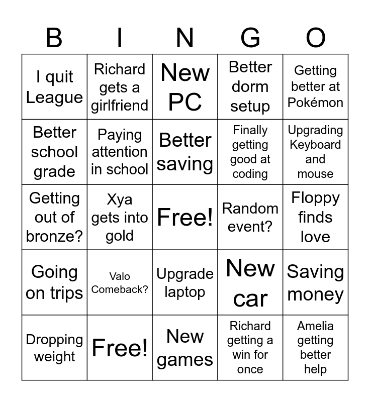 This bingo card has a free space and 24 words: Valo Comeback?, Free!, Better saving, Dropping weight, Getting better at Pokémon, I quit League, Better school grade, Richard gets a girlfriend, Random event?, Upgrade laptop, Finally getting good at coding, Getting out of bronze?, New car, Saving money, Paying attention in school, Richard getting a win for once, Floppy finds love, New PC, Upgrading Keyboard and mouse, Xya gets into gold, Amelia getting better help, Going on trips, Better dorm setup and New games.