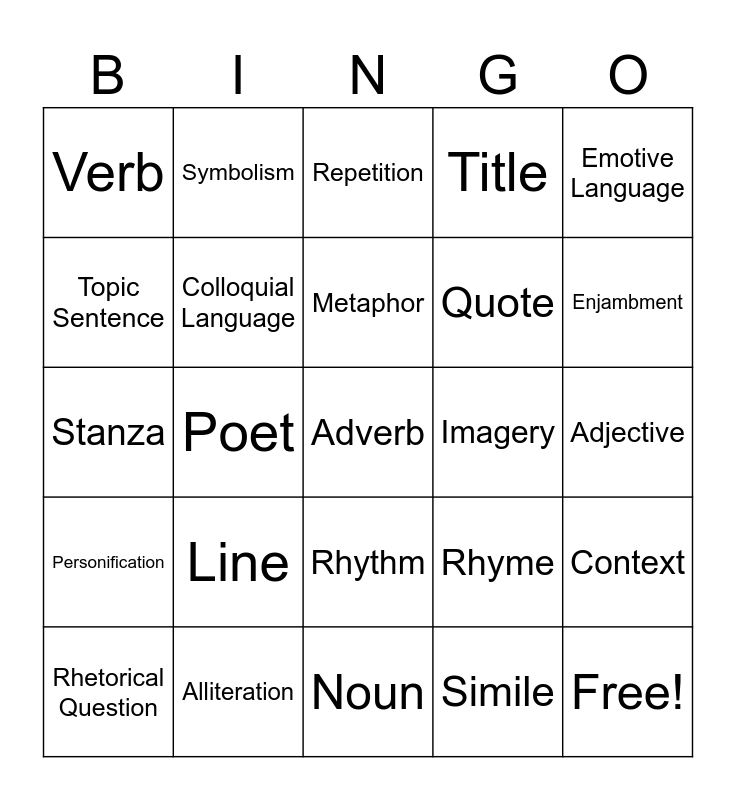 This bingo card has 34 words: Free!, Simile, Hyperbole, Onomatopoeia, Personification, Colloquial Language, Emotive Language, Rhetorical Question, Symbolism, Contrast, Metaphor, Repetition, Anaphora, Sibilance, Imagery, Enjambment, Alliteration, Stanza, Line, Rhyme, Rhythm, Tone, Verb, Adjective, Noun, Adverb, Title, Technique, Quote, Topic Sentence, TEEEC, Poet, Context and Theme.