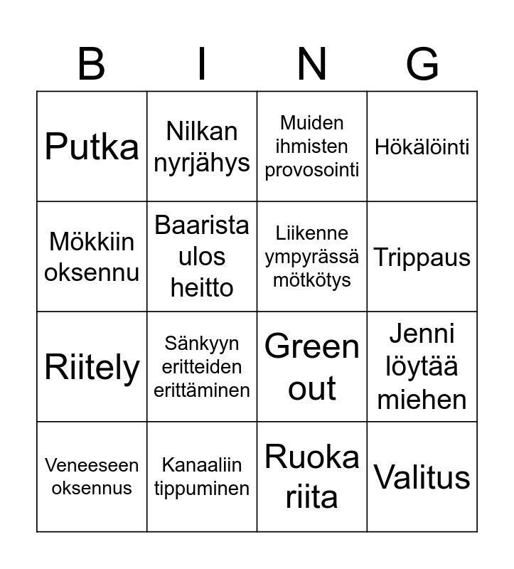 This bingo card has 16 words: Kanaaliin tippuminen, Jenni löytää miehen, Muiden ihmisten provosointi, Putka, Riitely, Nilkan nyrjähys, Green out, Ruoka riita, Mökkiin oksennu, Baarista ulos heitto, Veneeseen oksennus, Hökälöinti, Sänkyyn eritteiden erittäminen, Trippaus, Liikenne ympyrässä mötkötys and Valitus.