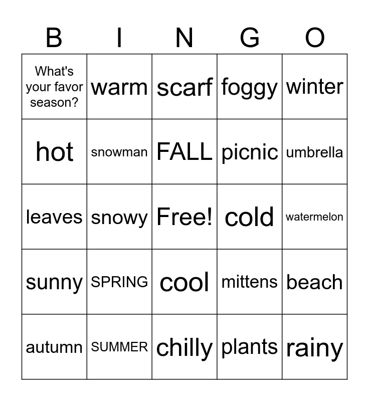 This bingo card has a free space and 24 words: SPRING, SUMMER, FALL, autumn, winter, What's your favor season?, hot, warm, cold, cool, picnic, leaves, mittens, beach, snowman, plants, watermelon, scarf, umbrella, snowy, rainy, sunny, foggy and chilly.