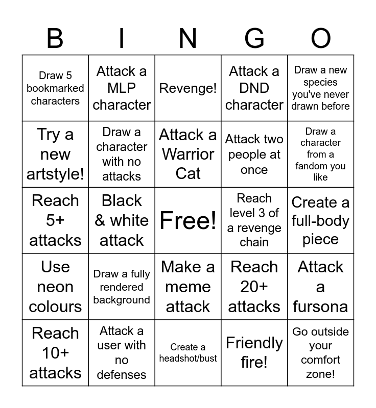 This bingo card has a free space and 29 words: Reach 10+ attacks, 3+ characters in one attack, Black & white attack, Draw with all colours of the rainbow in one attack, Draw 5 bookmarked characters, Revenge!, Draw a character with no attacks, Draw a fully rendered background, Reach level 3 of a revenge chain, Attack a user with no defenses, Create a full-body piece, Go outside your comfort zone!, Create a headshot/bust, Friendly fire!, Draw a character from a fandom you like, Draw a silly joke character, Make a meme attack, Use neon colours, Draw a new species you've never drawn before, Reach 5+ attacks, Reach 20+ attacks, Draw your characters with someone else's, Attack two people at once, Try a new artstyle!, Attack a DND character, Attack a MLP character, Attack a fursona, Attack a Warrior Cat and Attack a fandom you're unfamiliar with.