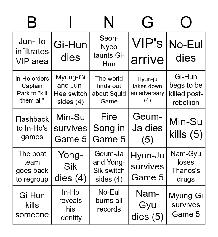 This bingo card has a free space and 24 words: Yong-Sik dies (4), In-Ho reveals his identity, The world finds out about Squid Game, Gi-Hun kills someone, No-Eul dies, Jun-Ho infiltrates VIP area, In-Ho orders Captain Park to "kill them all", Gi-Hun dies, Geum-Ja dies (5), Geum-Ja and Yong-Sik switch sides (4), Hyun-ju takes down an adversary (4), Flashback to In-Ho's games, Hyun-Ju survives Game 5, Nam-Gyu loses Thanos's drugs, Myung-Gi and Jun-Hee switch sides (4), Nam-Gyu dies (5), Min-Su kills (5), Seon-Nyeo taunts Gi-Hun, Gi-Hun begs to be killed post-rebellion, Min-Su survives Game 5, Myung-Gi survives Game 5, The boat team goes back to regroup, VIP's arrive and No-Eul burns all records.