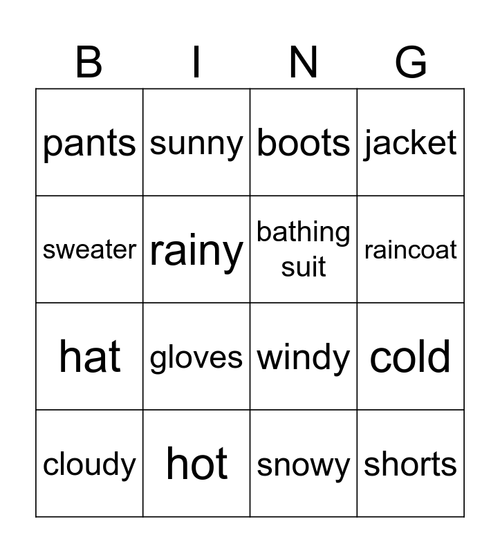 This bingo card has 16 words: hot, cold, boots, pants, hat, sunny, windy, snowy, sweater, rainy, cloudy, jacket, gloves, raincoat, bathing suit and shorts.