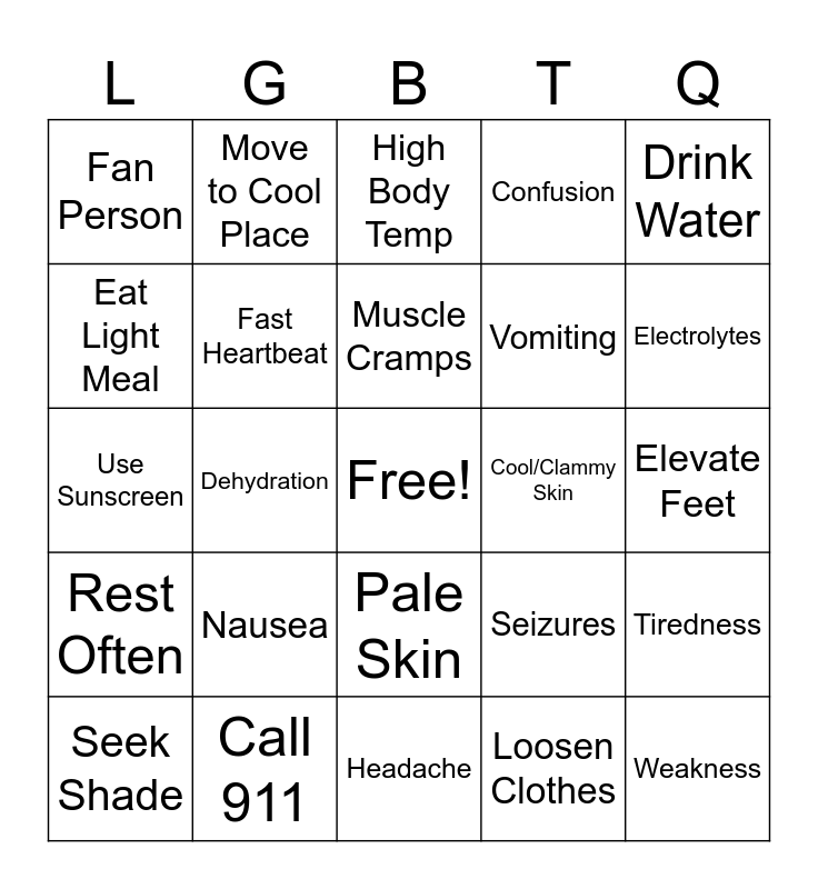 This bingo card has a free space and 24 words: Nausea, Call 911, Muscle Cramps, Seek Shade, Drink Water, Fan Person, Eat Light Meal, Move to Cool Place, Cool/Clammy Skin, Pale Skin, Vomiting, Use Sunscreen, Seizures, Tiredness, Fast Heartbeat, Loosen Clothes, Elevate Feet, High Body Temp, Electrolytes, Dehydration, Weakness, Rest Often, Confusion and Headache.