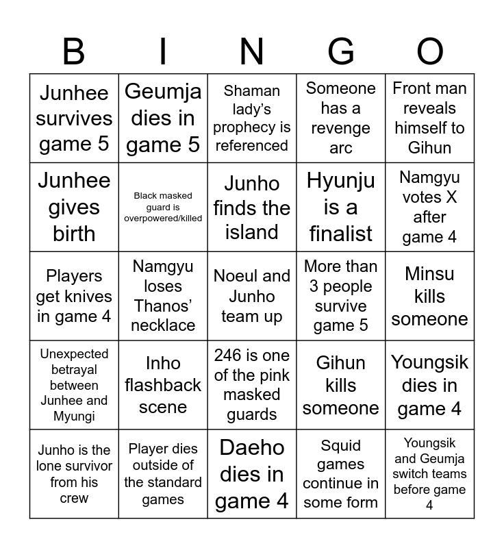 This bingo card has 25 words: Inho flashback scene, Daeho dies in game 4, Junho finds the island, Junho is the lone survivor from his crew, Front man reveals himself to Gihun, Junhee survives game 5, Junhee gives birth, Geumja dies in game 5, More than 3 people survive game 5, 246 is one of the pink masked guards, Hyunju is a finalist, Players get knives in game 4, Gihun kills someone, Youngsik dies in game 4, Black masked guard is overpowered/killed, Youngsik and Geumja switch teams before game 4, Minsu kills someone, Shaman lady’s prophecy is referenced, Namgyu votes X after game 4, Namgyu loses Thanos’ necklace, Noeul and Junho team up, Player dies outside of the standard games, Unexpected betrayal between Junhee and Myungi, Someone has a revenge arc and Squid games continue in some form.
