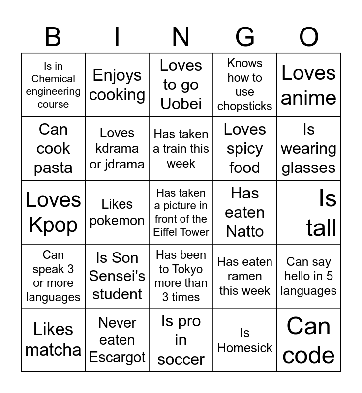 This bingo card has 25 words: Can speak 3 or more languages, Never eaten Escargot, Has taken a picture in front of the Eiffel Tower, Is Homesick, Loves anime, Is in Chemical engineering course, Enjoys cooking, Loves to go Uobei, Has eaten Natto, Can say hello in 5 languages, Can cook pasta, Loves kdrama or jdrama, Is pro in soccer, Has eaten ramen this week, Is wearing glasses, Likes matcha, Likes pokemon, Has taken a train this week, Loves spicy food, Is tall, Loves Kpop, Is Son Sensei's student, Has been to Tokyo more than 3 times, Knows how to use chopsticks and Can code.