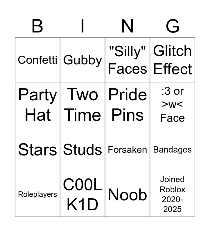 This bingo card has 22 words: C00L K1D, Fluff, Gubby, Burger hat guy, Two Time, Pride Pins, Confetti, "Silly" Faces, Forsaken, Joined Roblox 2020-2025, Stars, Glitch Effect, Pizza Guy, Maid Outfits, Noob, The Last Guest, Bandages, Roleplayers, Studs, Party Hat, :3 or >w< Face and Spawnpoint Pattern.