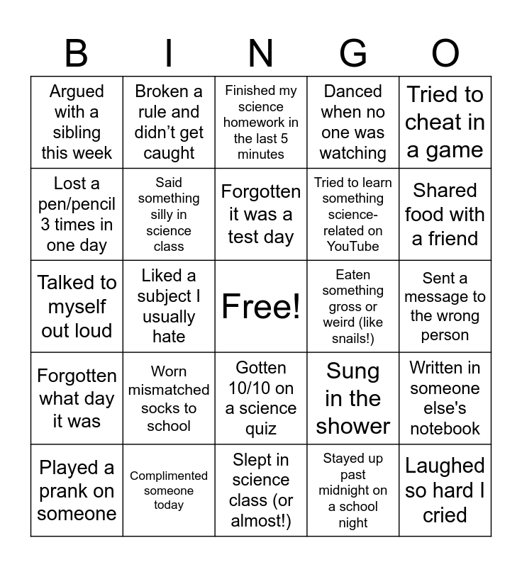 This bingo card has a free space and 46 words: Forgotten my homework, Laughed so hard I cried, Faked understanding something in science class, Slept in science class (or almost!), Worn mismatched socks to school, Gotten scared during a movie, Broken a rule and didn’t get caught, Helped a friend who was sad, Lost a pen/pencil 3 times in one day, Pretended to be sick to skip something, Said something silly in science class, Danced when no one was watching, Written in someone else's notebook, Sung in the shower, Tripped over nothing, Brought something weird in my school bag, Forgotten it was a test day, Eaten something gross or weird (like snails!), Gotten called out by a science teacher, Tried to cheat in a game, Liked a subject I usually hate, Stayed up past midnight on a school night, Argued with a sibling this week, Tried to learn something science-related on YouTube, Been super nervous before a science presentation, Shared food with a friend, Played a prank on someone, Read a comic during science class, Gotten 10/10 on a science quiz, Forgotten what day it was, Cleaned my room just because I was bored, Used an English word in a French sentence, Laughed during a serious moment in class, Missed the school bus, Gotten something stuck in my teeth, Complimented someone today, Sent a message to the wrong person, Dreamt I was late to school, Spilled food on my clothes, Tried to act like a science teacher, Wanted to switch seats in class, Finished my science homework in the last 5 minutes, Talked to myself out loud, Seen a ghost or something spooky, Wanted to throw my science notebook out the window and Been proud of something I did this week in science class.