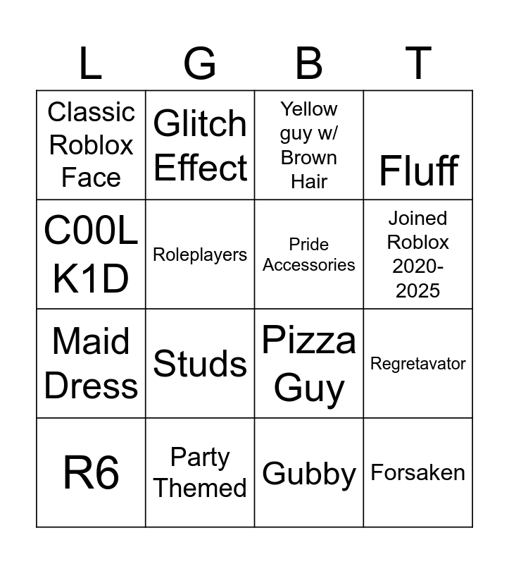 This bingo card has 19 words: Pizza Guy, Guest, Yellow guy w/ Brown Hair, Forsaken, Regretavator, C00L K1D, Gubby, Classic Roblox Face, Glitch Effect, Maid Dress, Studs, Roleplayers, Pride Accessories, Party Themed, R6, :3 Type Faces, Fluff, Joined Roblox 2020-2025 and Dandy's World.