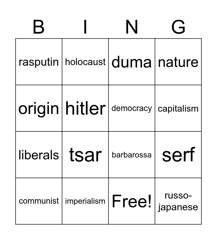This bingo card has 17 words: Free!, communist, duma, rasputin, tsar, nature, serf, democracy, capitalism, hitler, imperialism, barbarossa, origin, holocaust, liberals, concentration and russo-japanese.