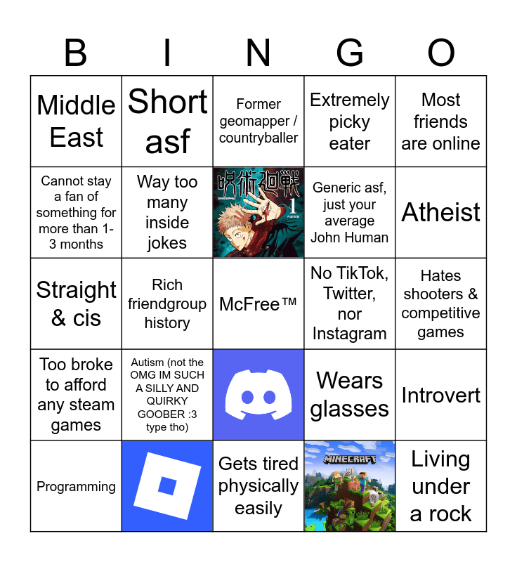This bingo card has 4 images, a free space and 20 words: Autism (not the OMG IM SUCH A SILLY AND QUIRKY GOOBER :3 type tho), Programming, Most friends are online, Middle East, Cannot stay a fan of something for more than 1-3 months, Short asf, No TikTok, Twitter, nor Instagram, Generic asf, just your average John Human, Straight & cis, Wears glasses, Introvert, Way too many inside jokes, Hates shooters & competitive games, Former geomapper / countryballer, Atheist, Rich friendgroup history, Living under a rock, Too broke to afford any steam games, Extremely picky eater and Gets tired physically easily.