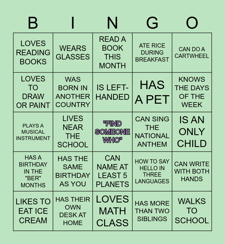 This bingo card has a free space and 24 words: HAS THE SAME BIRTHDAY AS YOU, HAS THEIR OWN DESK AT HOME, IS LEFT-HANDED, LIKES TO EAT ICE CREAM, CAN DO A CARTWHEEL, LOVES READING BOOKS, LOVES TO DRAW OR PAINT, WEARS GLASSES, CAN SING THE NATIONAL ANTHEM, CAN NAME AT LEAST 5 PLANETS, HAS A PET, PLAYS A MUSICAL INSTRUMENT, HOW TO SAY HELLO IN THREE LANGUAGES, CAN WRITE WITH BOTH HANDS, WAS BORN IN ANOTHER COUNTRY, HAS MORE THAN TWO SIBLINGS, IS AN ONLY CHILD, READ A BOOK THIS MONTH, KNOWS THE DAYS OF THE WEEK, LIVES NEAR THE SCHOOL, WALKS TO SCHOOL, HAS A BIRTHDAY IN THE "BER" MONTHS, ATE RICE DURING BREAKFAST and LOVES MATH CLASS.