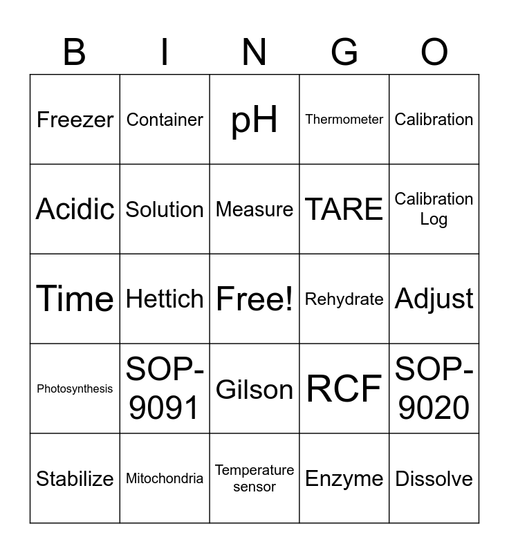 This bingo card has a free space and 79 words: Store, Reagent, pH, Electrode, Temperature, Repeat, Waterbath, Incubate, Centrifuge, Balance, Pipette, Timer, Thermometer, Freezer, Fridge, Acidic, Alkaline, SOP-9091, Stabilize, Adjust, Storage, Calibration, Time, Measure, Solution, HCl, Storage buffer, Prepare, Decant, Hydron ions, Calibration Log, Suspended, Temperature sensor, Display, Stabilize, Rehydrate, Lab equipment, Service, Water level, Dissolve, Adjusting, Monitoring, Reflux, Verify, Label, Container, Concentrated, Dissolution, Incubation, Consistency, SOP-9020, Hettich, RCF, RPM, EtOH, 70%, Vortex, NRCC, Semi-automatic, Gilson, TARE, Analytical, Glass, In-house, Tissue, pHMeter, NaOH, SOP-4001, Ultra-low freezer, Photosynthesis, Mitochondria, Catalyst, Atomic, Molecule, Electron, Enzyme, Chromatography, Polymer and Diffusion.