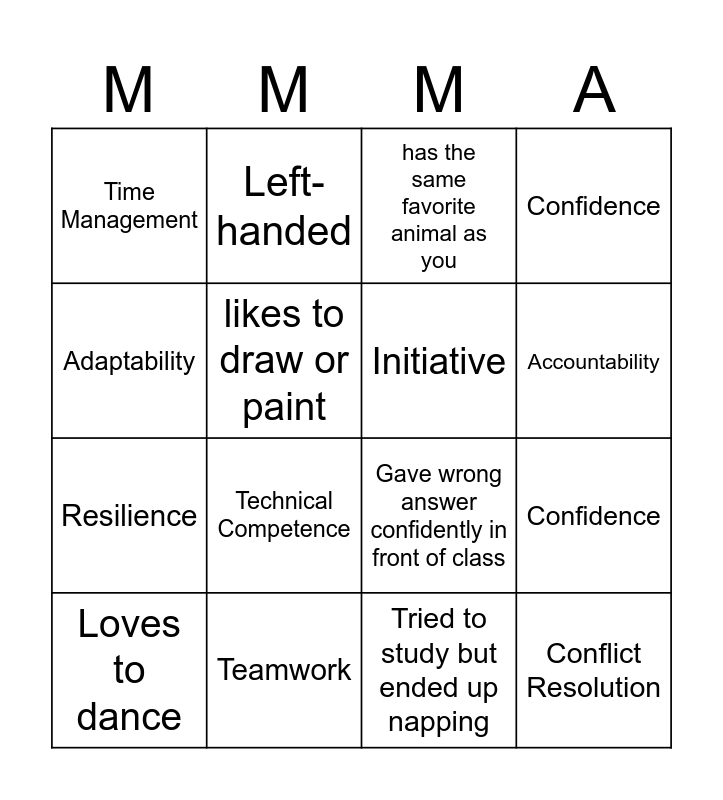 This bingo card has 49 words: Free!, Loves to dance, Wearing eyeglasses, Likes to read books, Can speak another language, Born on the same month as you, Left-handed, can whistle, likes to draw or paint, has a sibling, Initiative, Confidence, Vision, Discipline, Communication, Decision-Making, Accountability, Teamwork, Problem-Solving, Adaptability, Confidence, Integrity, Time Management, Resilience, Situational Awareness, Technical Competence, Initiative, Mentorship, Critical Thinking, Conflict Resolution, Emotional Intelligence, Delegation, Strategic Planning, Answered confidently… but was totally wrong, Laughed during a serious moment, Pretended to understand the lesson, Slipped or tripped in front of classmates, Sang in the shower too loud, Tried to study but ended up napping, Had a funny nickname in school, Accidentally replied in group chat thinking it was private, Got called for recitation while daydreaming, Got caught dancing or singing alone in the dorm, Wrote notes so messy, you couldn’t read them, Gave wrong answer confidently in front of class, has the same favorite animal as you, Practiced a speech in front of the mirror, Laughed at your own joke before finishing it and Borrowed something and forgot who you borrowed it from.