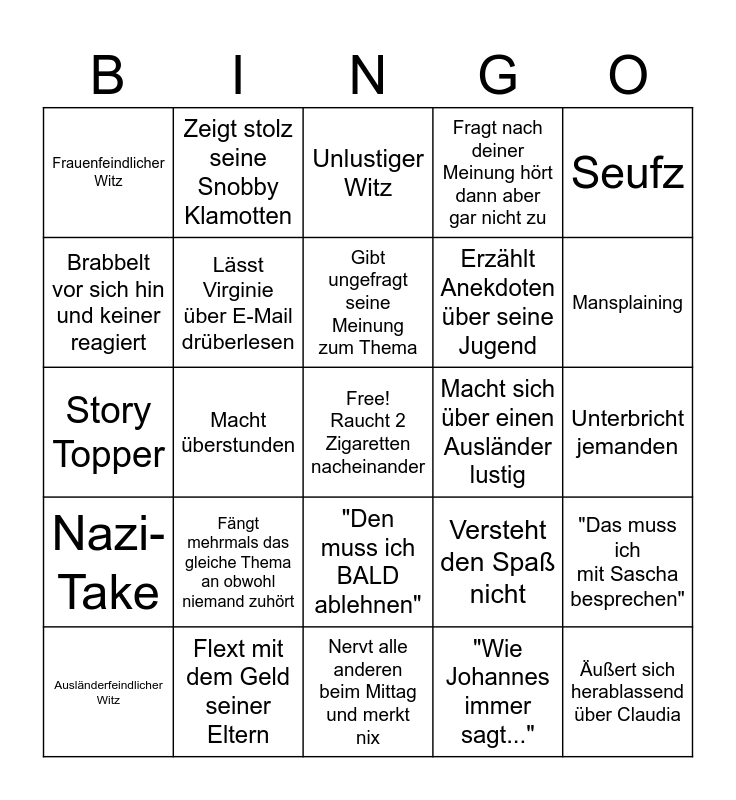 This bingo card has a free space and 24 words: Fängt mehrmals das gleiche Thema an obwohl niemand zuhört, Flext mit dem Geld seiner Eltern, Gibt ungefragt seine Meinung zum Thema, Ausländerfeindlicher Witz, Seufz, Frauenfeindlicher Witz, Brabbelt vor sich hin und keiner reagiert, Zeigt stolz seine Snobby Klamotten, Macht sich über einen Ausländer lustig, "Den muss ich BALD ablehnen", Erzählt Anekdoten über seine Jugend, Story Topper, Versteht den Spaß nicht, "Das muss ich mit Sascha besprechen", Lässt Virginie über E-Mail drüberlesen, "Wie Johannes immer sagt...", Unterbricht jemanden, Unlustiger Witz, Mansplaining, Macht überstunden, Äußert sich herablassend über Claudia, Nazi-Take, Fragt nach deiner Meinung hört dann aber gar nicht zu and Nervt alle anderen beim Mittag und merkt nix.