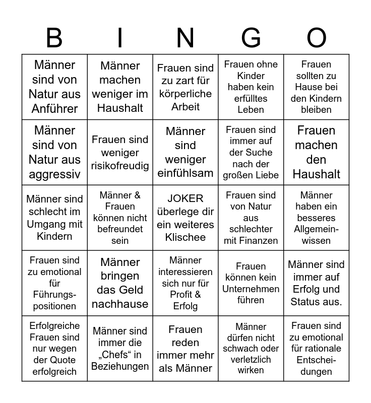 This bingo card has a free space and 34 words: Frauen können nicht Autofahren, Männer dürfen nicht schwach oder verletzlich wirken, Männer sind keine guten Zuhörer, Männer sind nur an Sport & Bier interessiert, Frauen sind zu emotional für Führungs-positionen, Frauen sind weniger risikofreudig, Frauen sollten zu Hause bei den Kindern bleiben, Erfolgreiche Frauen sind nur wegen der Quote erfolgreich, Männer machen weniger im Haushalt, Frauen die Kinder haben & arbeiten sind schlechte Mütter, Männer sind weniger einfühlsam, Frauen sind zu zart für körperliche Arbeit, Männer die Emotionen zeigen sind schwach, Frauen brauchen immer die Bestätigung von Männern, Frauen sind von Natur aus schlechter mit Finanzen, Frauen machen den Haushalt, Männer sind immer die „Chefs“ in Beziehungen, Männer sind schlecht im Umgang mit Kindern, Männer bringen das Geld nachhause, Frauen können kein Unternehmen führen, Männer interessieren sich nur für Profit & Erfolg, Männer sind nicht in der Lage, Gefühle zu zeigen, Männer sind von Natur aus Anführer, Männer haben ein besseres Allgemein-wissen, Frauen reden immer mehr als Männer, Frauen sind zu emotional für rationale Entschei-dungen, Frauen ohne Kinder haben kein erfülltes Leben, Frauen sind schlechter im Umgang mit Geld, Frauen sind immer auf der Suche nach der großen Liebe, Männer sind von Natur aus aggressiv, Männer haben Schwierig-keiten mit Multitasking, Männer & Frauen können nicht befreundet sein, Männer sind immer auf Erfolg und Status aus. and Frauen gehören in die Küche.