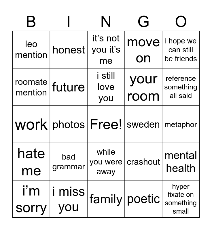 This bingo card has a free space and 24 words: bad grammar, i miss you, i still love you, i’m sorry, i hope we can still be friends, leo mention, roomate mention, honest, sweden, while you were away, your room, work, crashout, mental health, future, poetic, metaphor, it’s not you it’s me, reference something ali said, photos, hyper fixate on something small, hate me, move on and family.