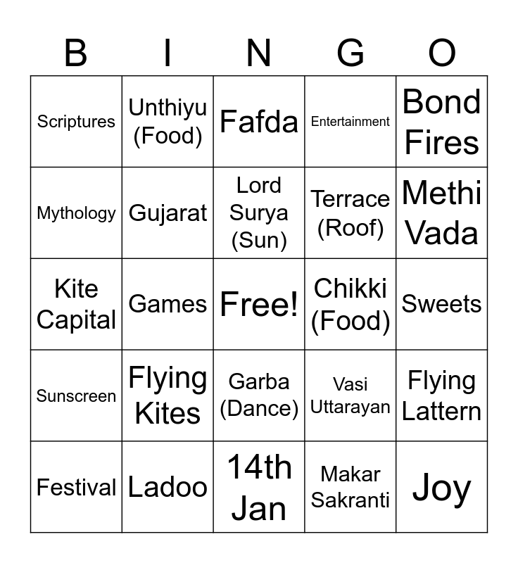 This bingo card has a free space and 24 words: Flying Kites, Ladoo, Lord Surya (Sun), Festival, Bond Fires, Scriptures, Mythology, Unthiyu (Food), Chikki (Food), Garba (Dance), Terrace (Roof), Kite Capital, Vasi Uttarayan, Flying Lattern, Gujarat, Makar Sakranti, Sweets, Fafda, Methi Vada, Games, Joy, Sunscreen, Entertainment and 14th Jan.