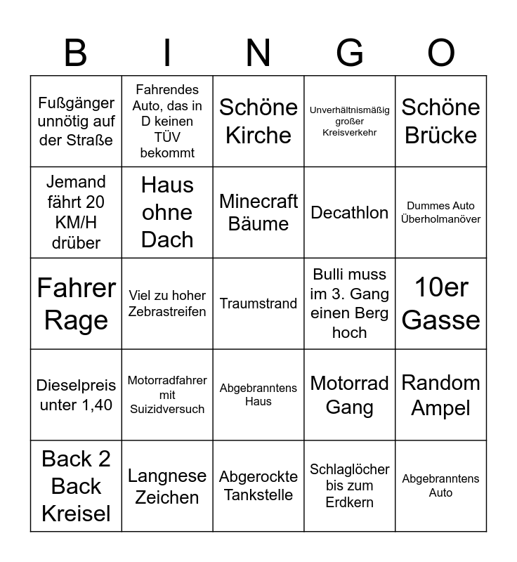 This bingo card has a free space and 24 words: Motorradfahrer mit Suizidversuch, Langnese Zeichen, Minecraft Bäume, Back 2 Back Kreisel, Schöne Brücke, Fußgänger unnötig auf der Straße, Jemand fährt 20 KM/H drüber, Fahrendes Auto, das in D keinen TÜV bekommt, Bulli muss im 3. Gang einen Berg hoch, Abgebranntens Haus, Decathlon, Fahrer Rage, Motorrad Gang, Random Ampel, Haus ohne Dach, Schlaglöcher bis zum Erdkern, 10er Gasse, Schöne Kirche, Dummes Auto Überholmanöver, Viel zu hoher Zebrastreifen, Abgebranntens Auto, Dieselpreis unter 1,40, Unverhältnismäßig großer Kreisverkehr and Abgerockte Tankstelle.