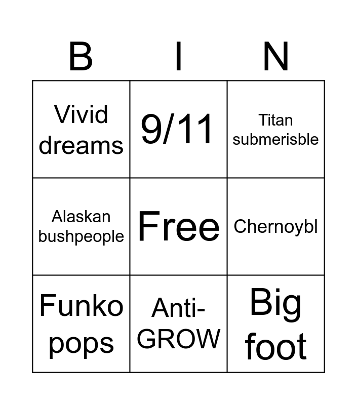 This bingo card has a free space and 8 words: Chernoybl, Titan submerisble, 9/11, Funko pops, Vivid dreams, Big foot, Alaskan bushpeople and Anti-GROW.