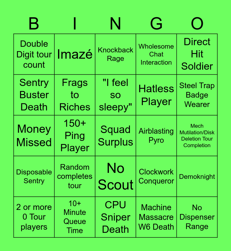 This bingo card has a free space and 24 words: Random completes tour, 10+ Minute Queue Time, "I feel so sleepy", 2 or more 0 Tour players, Direct Hit Soldier, Double Digit tour count, Sentry Buster Death, Imazé, Airblasting Pyro, No Scout, Hatless Player, Money Missed, Clockwork Conqueror, Demoknight, Frags to Riches, Machine Massacre W6 Death, Mech Mutilation/Disk Deletion Tour Completion, Knockback Rage, Steel Trap Badge Wearer, 150+ Ping Player, No Dispenser Range, Disposable Sentry, Wholesome Chat Interaction and CPU Sniper Death.
