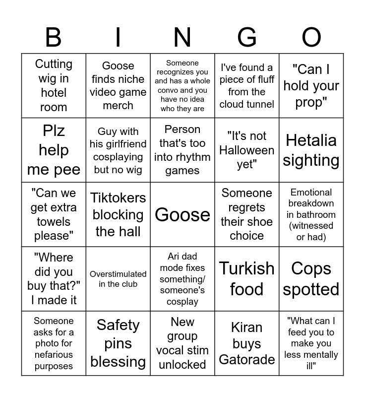 This bingo card has a free space and 38 words: Accidentally adopting someone, Ari warns everyone the steamer is hot, Guy with his girlfriend that didn't bother wearing a costume, Guy with his girlfriend cosplaying but no wig, Cops spotted, Overstimulated in the club, Person that's too into rhythm games, Just someone's dad, "Can I hold your prop", "It's not Halloween yet", Tiktokers blocking the hall, I've found a piece of fluff from the cloud tunnel, "What can I feed you to make you less mentally ill", Emotional breakdown in bathroom (witnessed or had), Plz help me pee, "Where did you buy that?" I made it, "That's my ex", Someone recognizes you and has a whole convo and you have no idea who they are, "Oh I love (wrong character)", Someone regrets their shoe choice, Cutting wig in hotel room, Safety pins blessing, Hetalia sighting, Someone asks for a photo for nefarious purposes, New crackship unlocked, New group vocal stim unlocked, "Take this meme photo for me", Drunk girl compliment, No service in the artist alley, "When's the last time you had water?", Someone gets an insane steal at the flea market, Ari dad mode fixes something/ someone's cosplay, Kiran buys Gatorade, Goose finds niche video game merch, Mar gets complimented on their sugar apple fairytale bag, Turkish food, "Can we get extra towels please" and It takes atleast 3 ppl to figure out the hotel TV.