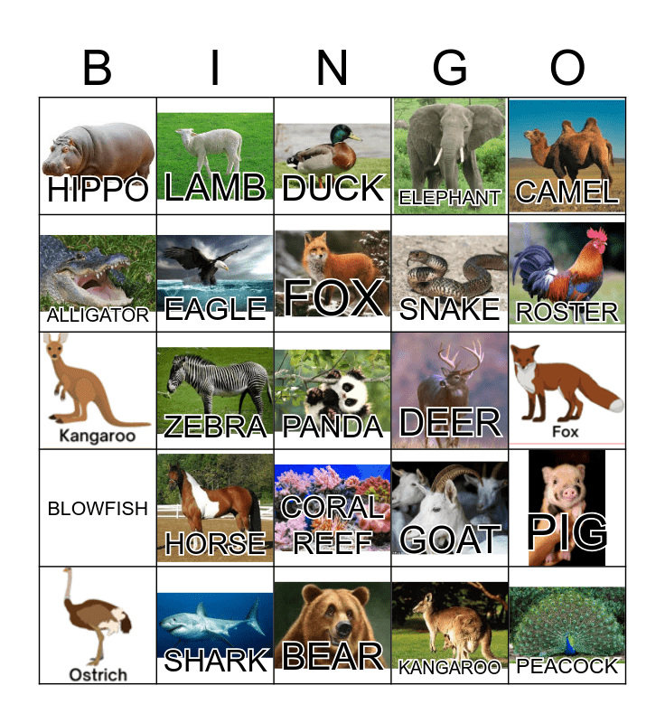 This bingo card has 47 images and 39 words: BLOWFISH, PANDA, TIGER, BEAR, HORSE, GIRRAFE, LAMB, LION, ALLIGATOR, TURTLE, EAGLE, ELEPHANT, PIG, GOAT, DONKEY, FOX, DEER, MONKEY, CAMEL, ZEBRA, KANGAROO, HIPPO, SNAKE, STARFISH, PEACOCK, ROSTER, TURTLE, DUCK, CORAL REEF, TURKEY, FROG, SEAHORSE, SHARK, CAT, DOG, RABBIT, BLOWFISH, BLOWFISH and BLOWFISH.