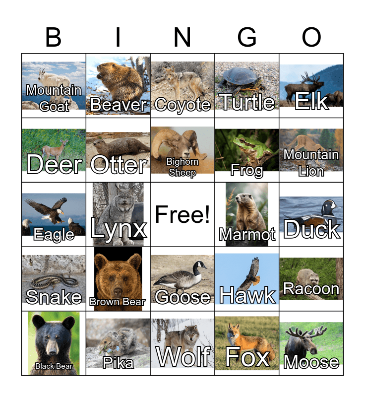 This bingo card has 24 images, a free space and 24 words: Brown Bear, Pika, Bighorn Sheep, Black Bear, Elk, Mountain Goat, Deer, Beaver, Marmot, Goose, Frog, Eagle, Hawk, Racoon, Otter, Fox, Duck, Coyote, Mountain Lion, Lynx, Moose, Snake, Turtle and Wolf.
